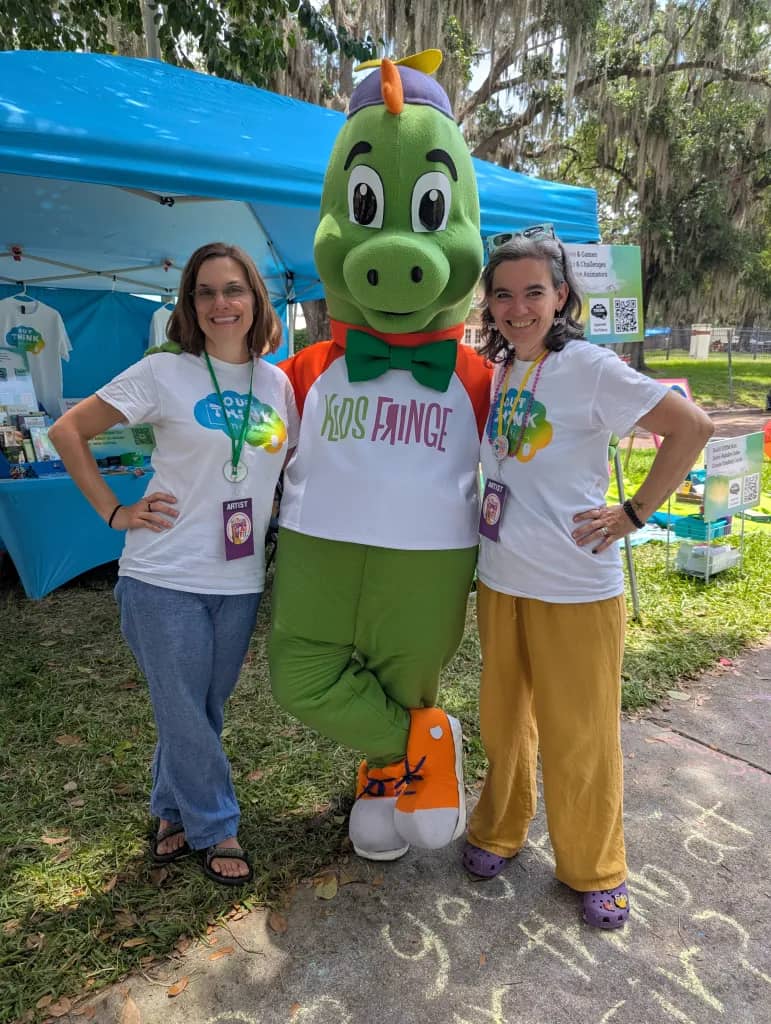 PR Consultant Anne Collins, Fringezilla, and Cindy Marie Jenkins at 2025 Orlando Kids Fringe Festival.